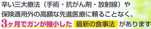 辛い三大療法(手術・抗がん剤・放射線)や保険適用外の高額な先進医療に頼ることなく、3ヶ月でガンが消えた“最新の食事法”です。副作用や後遺症に苦しむことなく、精神的な不安や経済的な負担も減らして、穏やかに暮らせる生活を手に入れませんか? あなたが、今仮に“絶望”の淵に立たされていたとしても、私たちには、その絶望を大きな“希望”に変える自信があります。 大いに期待してください。